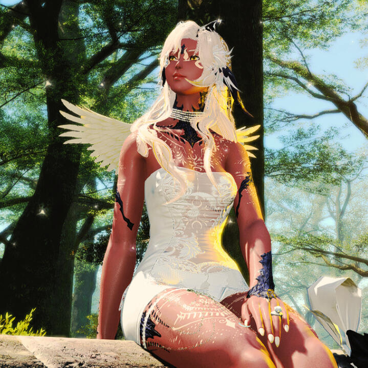Deep in the forest of the Sylphlands, amongst the wildlife, she's known to find refuge. Perched high in the trees, she enjoys quiet moments to herself.Black Shroud - The Lavender Beds